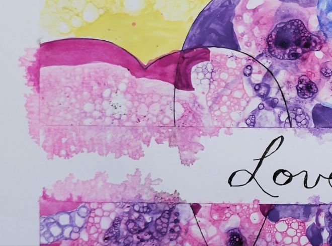 I used dish soap inside the hearts, and play bubbles for the yellow surrounding them. Once it was all dry, I filled in the non-bubbly spaces with my paintbrush.