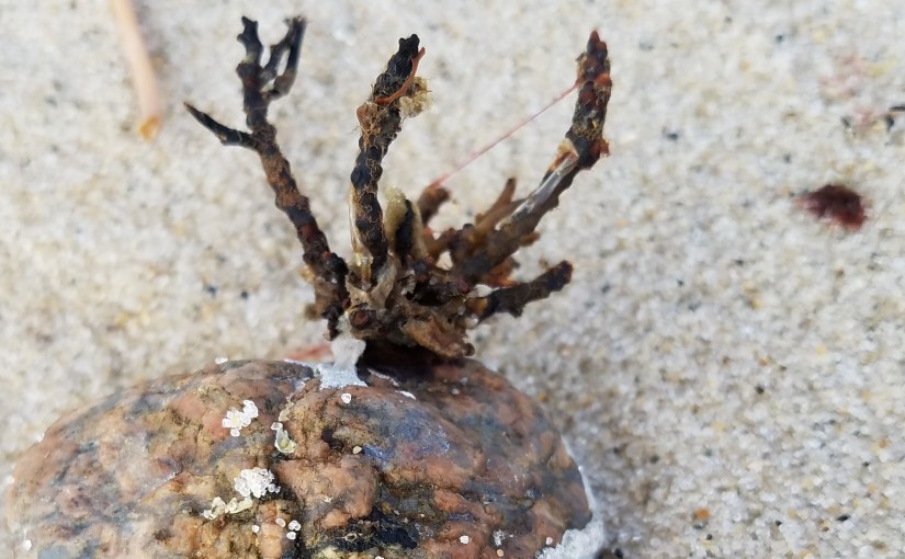 I found this little rock washed up on the beach a few weeks ago, with a strange growth attached. It almost looks like a coral, but we’re too far north to find that around here. I’ll venture to say that it’s seaweed. Whatever it is, I’m sure that when it got anchored to that rock, it never saw itself being washed ashore! The rock was protected somewhere on the ocean floor for quite a while to give this specimen time to grow. And then the storms came.