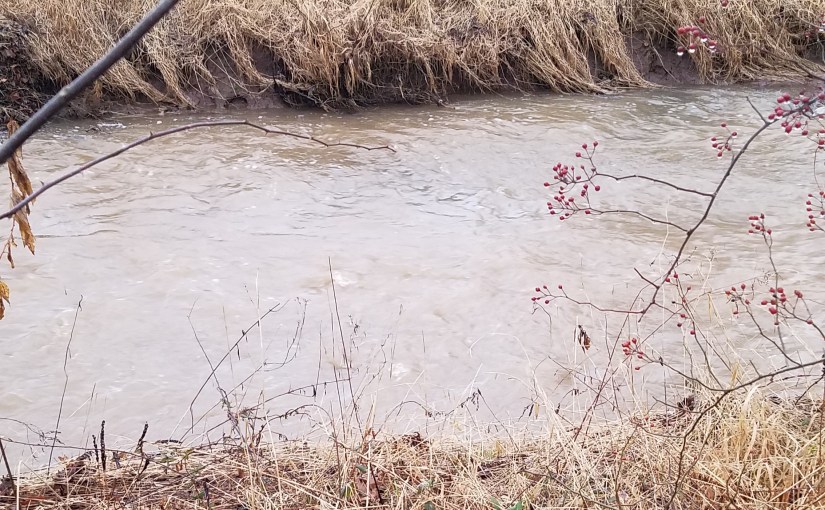 While visiting my dad last week, we had a stretch of heavy rain. Streams that are normally crystal clear to the bottom filled up with muddy water that you couldn’t see anything through! The amount of water running through the creek beds knocked dirt off the banks where the water doesn’t normally reach, and carried it away downstream to be dropped somewhere else.