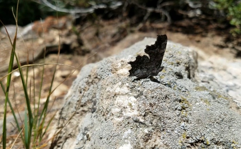 We had taken a boat ride across Jennie Lake and hiked up the Cascade Canyon Trail, and were stopped for lunch before heading back to catch the boat again. As we were sitting there, this strange-looking butterfly stopped for a rest. It really looked out of place on the boulder, like it should be on the side of a tree trunk somewhere instead, or on some really curly lichen. There it would definitely be camouflaged! But here its strange shape stood out quite well.