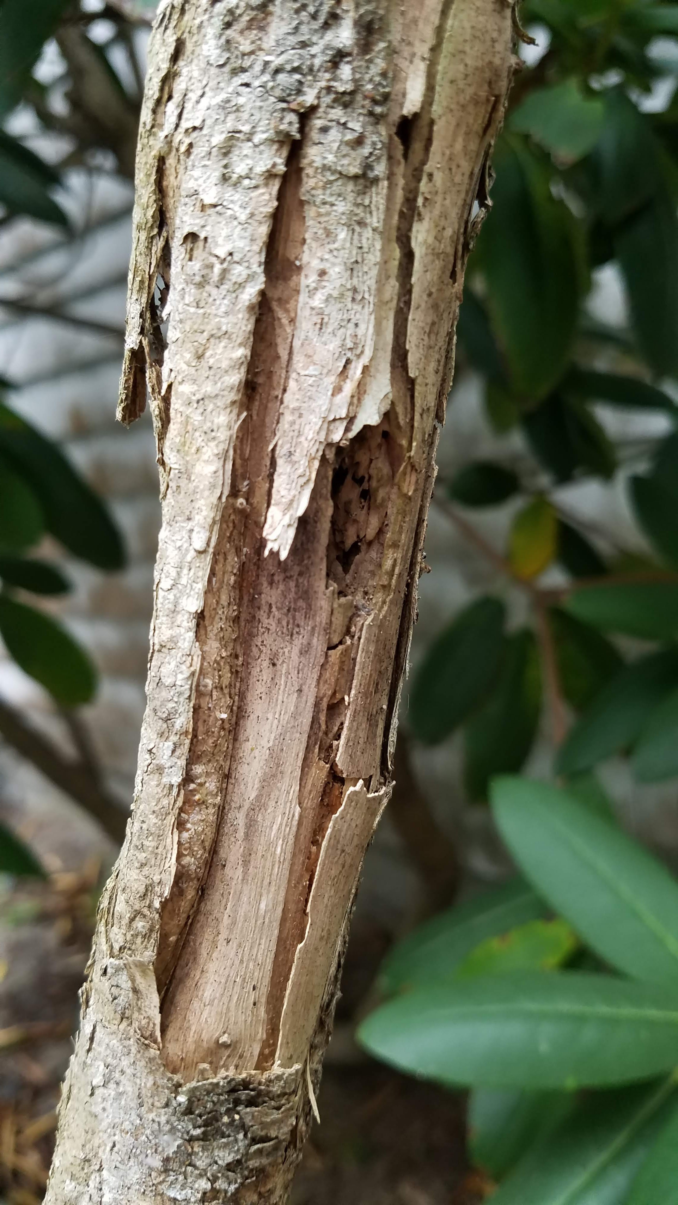 missing bark and cracked inner wood strewn with holes.