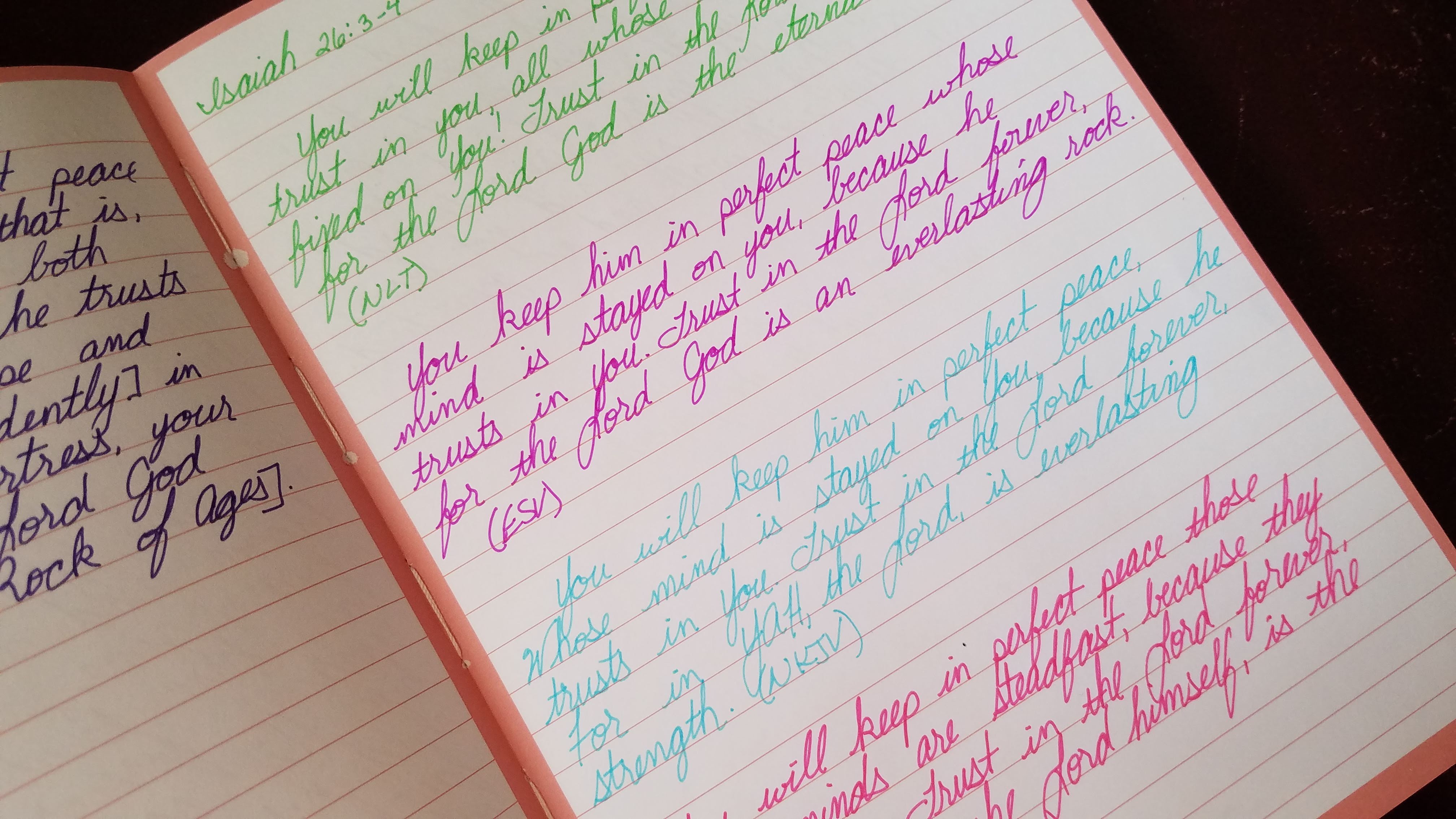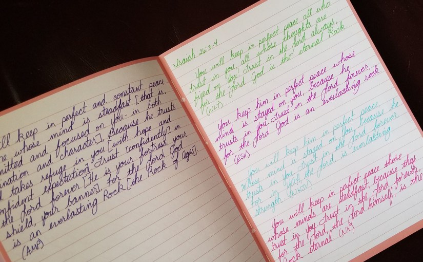 3. Each night I look up the Scripture in several different versions. On this day I wrote out Isaiah 26:3-4 as found in five different translations, using a new color for each version.