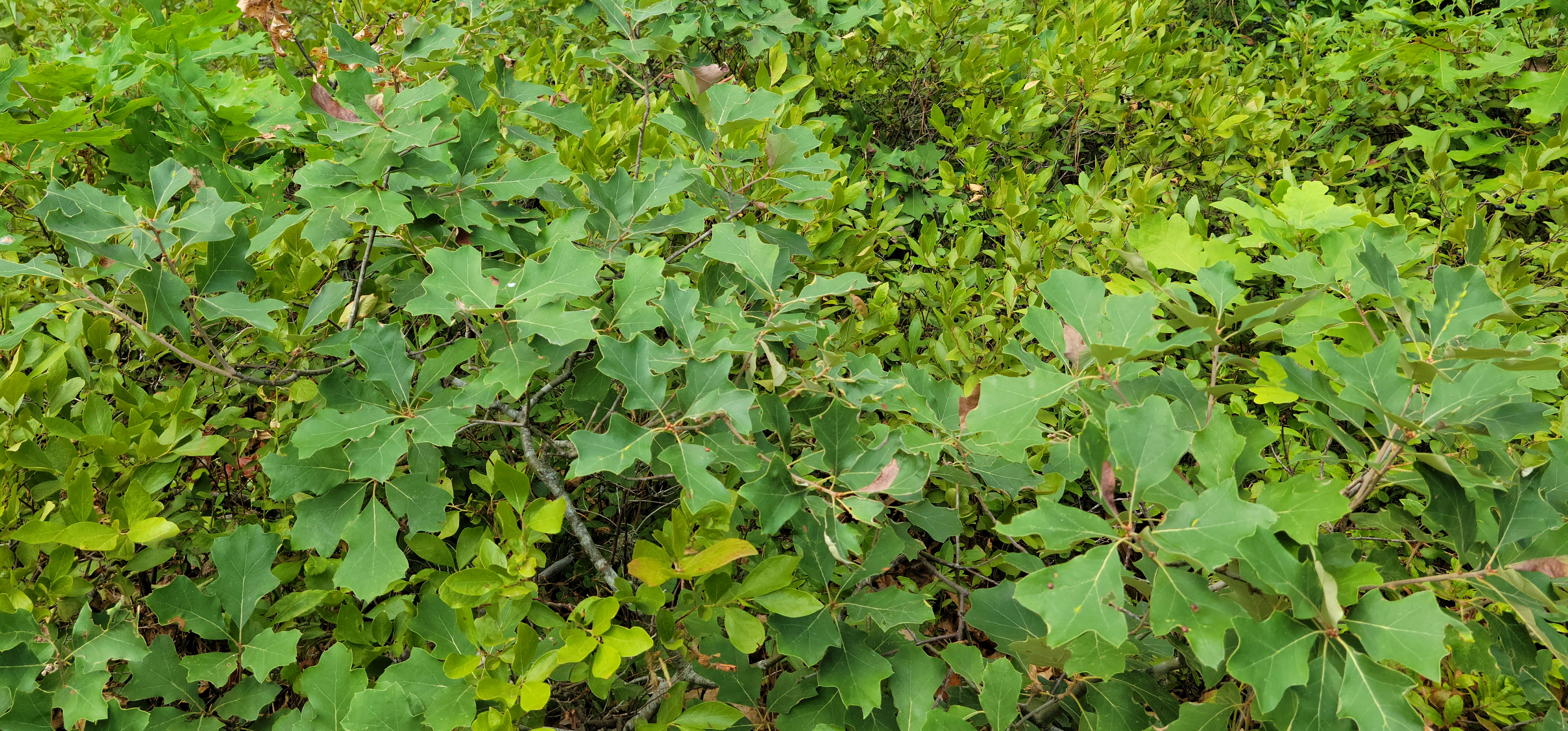 The scrub oak is toward the bottom right, with more rounded leaf lobes, and the black oak is taller with pointed leaf lobes.
