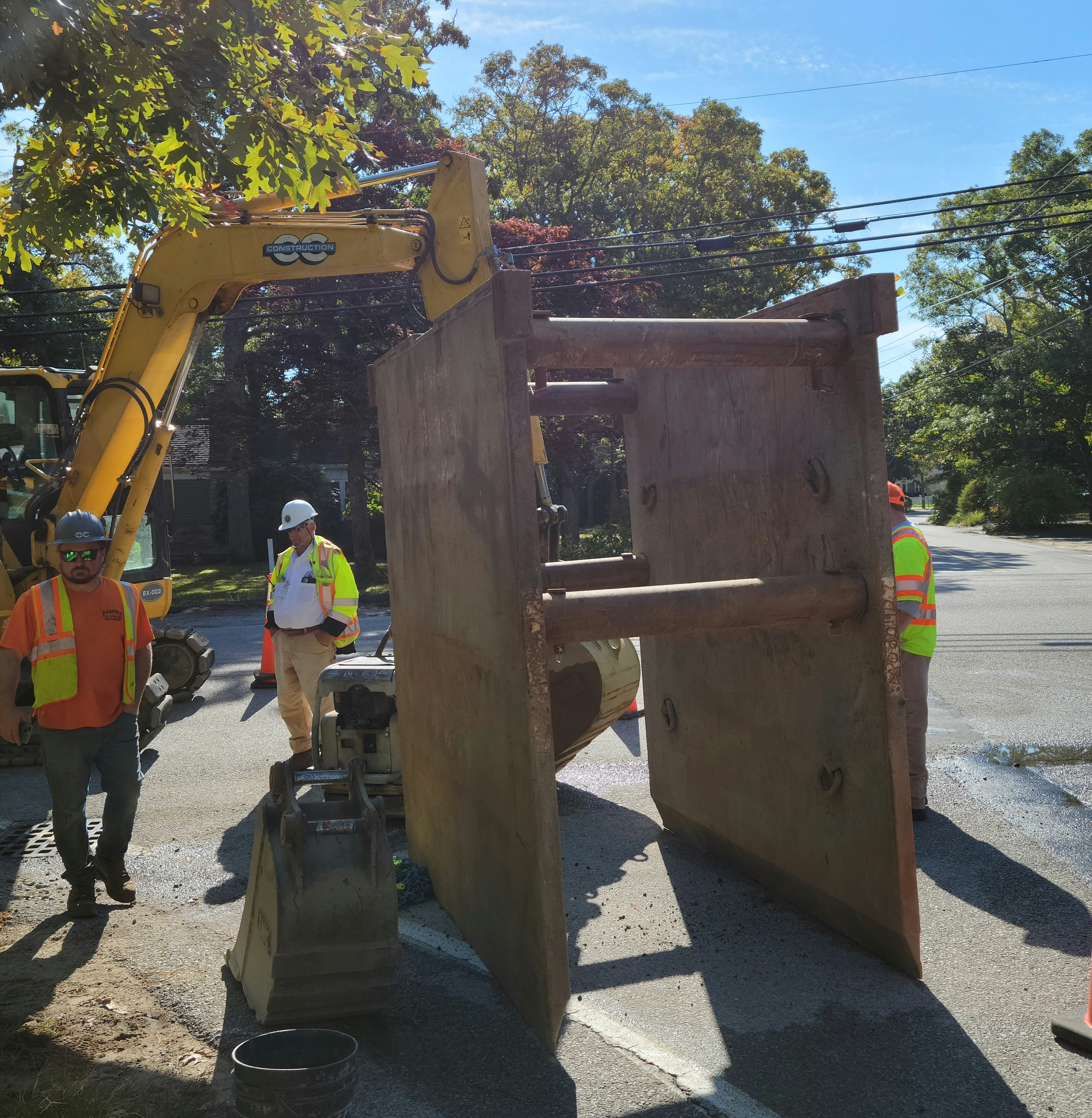 We’ve got sewer construction happening along our street, with water diversion construction going on right outside our house. To work on diverting the water, workers must dig trenches. To keep the trench from collapsing on their heads, they install trench boxes first, which support the walls of the trenches.