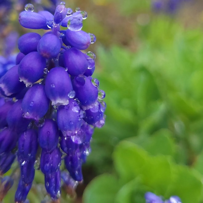 Raindrops on grape hyacinth blooms